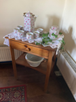 Der Plan war im Garten zu sitzen, doch der Himmel meinte es spannend mit uns – mal Sonne, mal drohender Regenguss. Margret und Detlef entschieden sich dann doch für Plan B: „Rein in die Diele!“ Diese war aufwendig und sehr gemütlich hergerichtet.